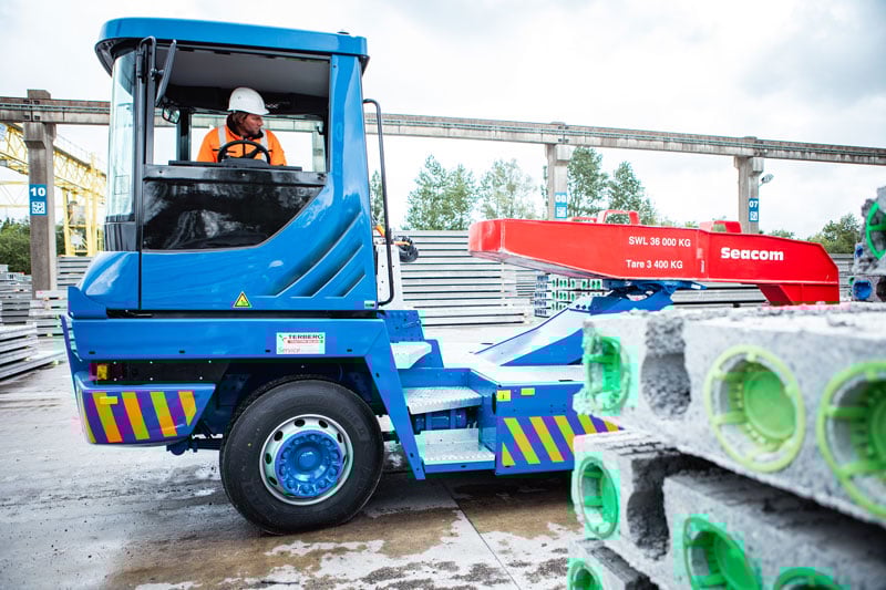 The Willy Naessens Group has been a Terberg customer for over twenty years and uses Terberg tractors at eight concrete products plants. The vehicles are maintained by Terberg Tractors Belgium which also supplied the Seacom roll trailers, goosenecks and parking stands used at these plants. All these tractors are covered by a Terberg maintenance contract.