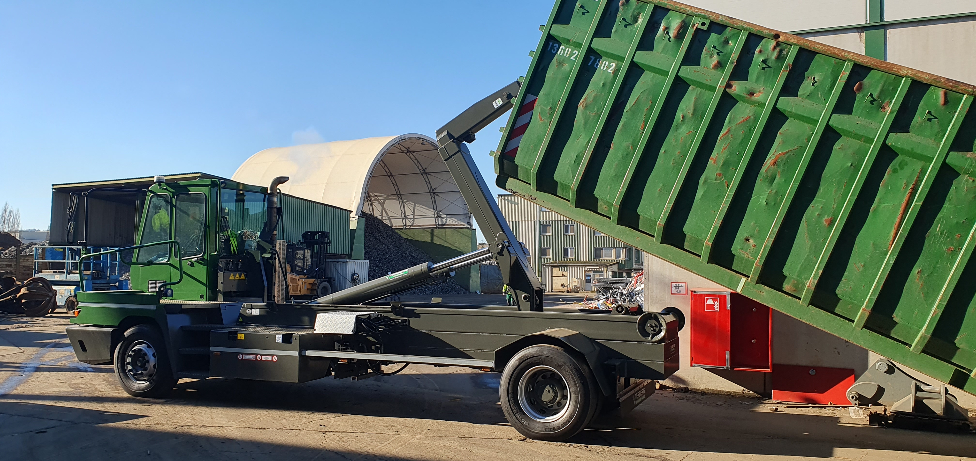 Het haakarmsysteem is uitgerust met een ijlgangfunctie voor het snel kunnen afzetten van lege containers, een hulpkipcilinder voor het ontlasten van de kipcilinders en een mechanisch in hoogte verstelbare opneemhaak geschikt voor het opnemen van containers met verschillende haakhoogtes.